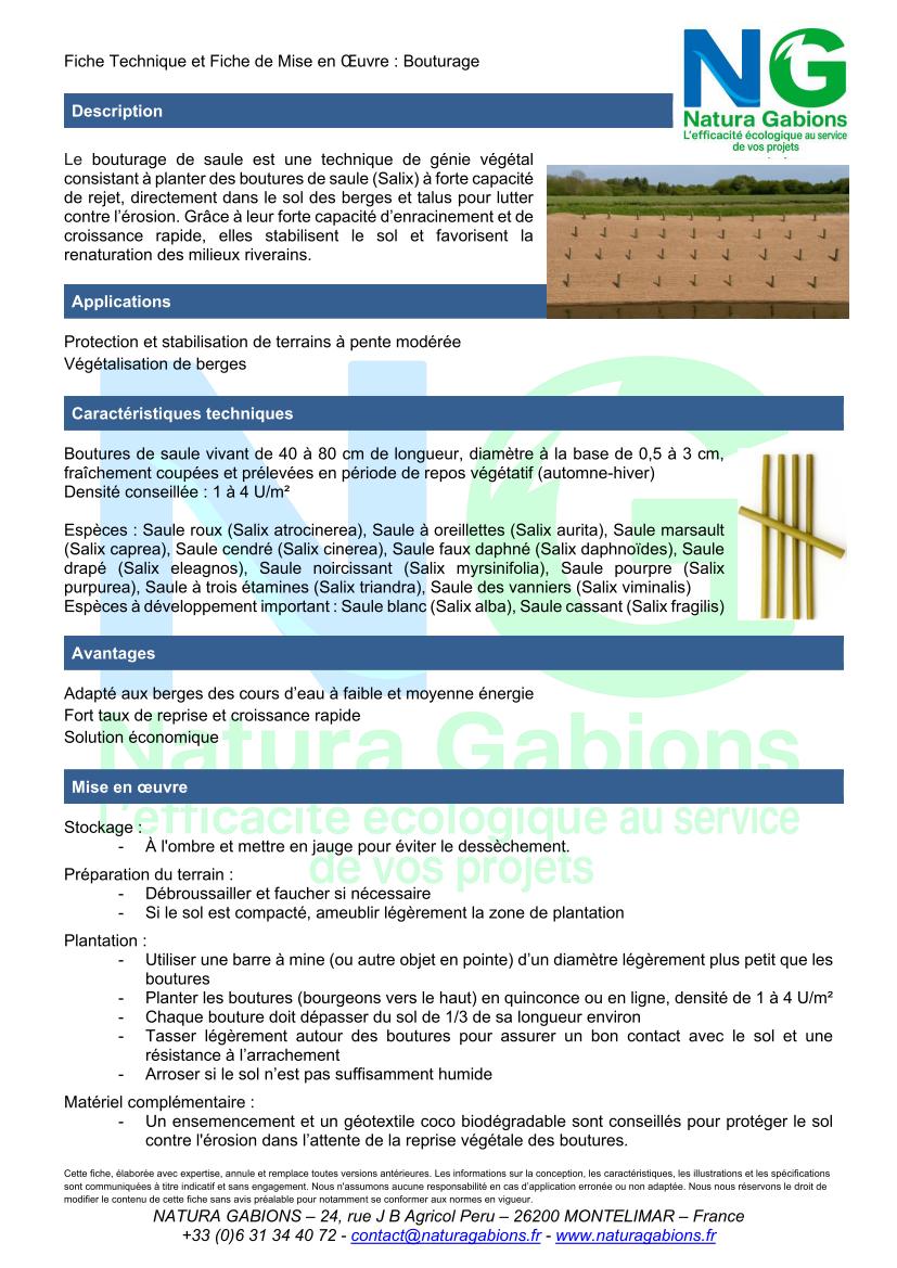 Les techniques à base de saule (boutures, fascines, tressage, lits de plants, couches de branches, caissons végétalisés) constituent différentes solutions complètes pour la lutte contre l’érosion et la stabilisation des sols. Elles combinent :