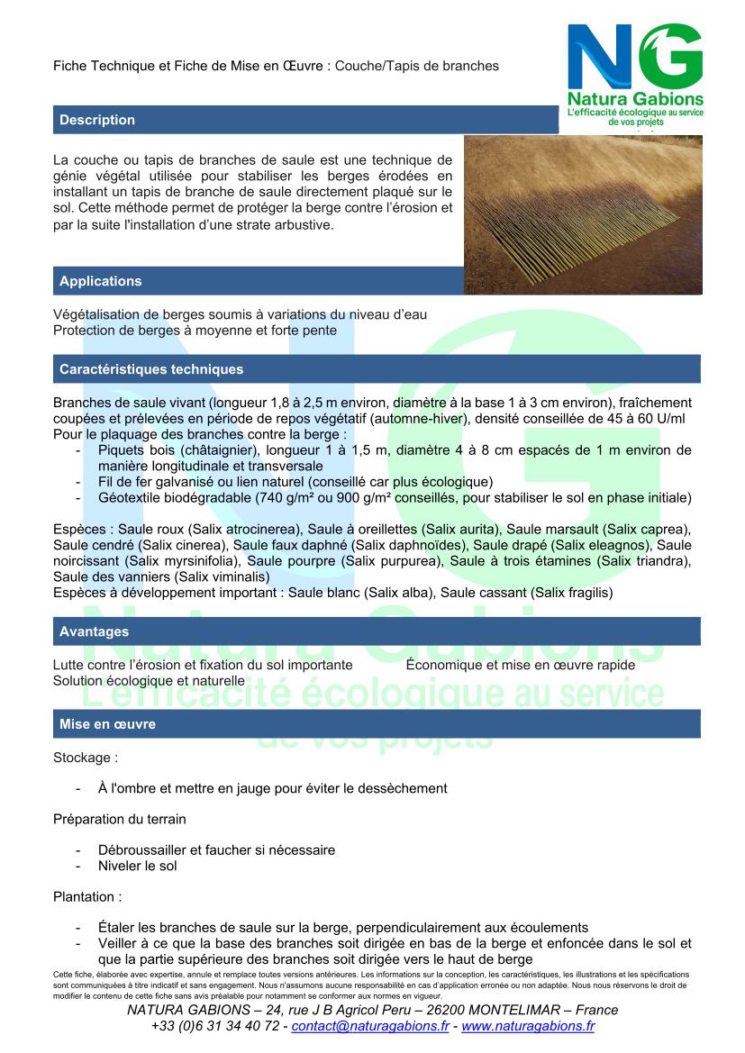 La couche de branches aussi appelé tapis de branches est une technique simple qui consiste à poser de longues branches vivantes de saule à plat, en couches successives, recouvertes de terre.