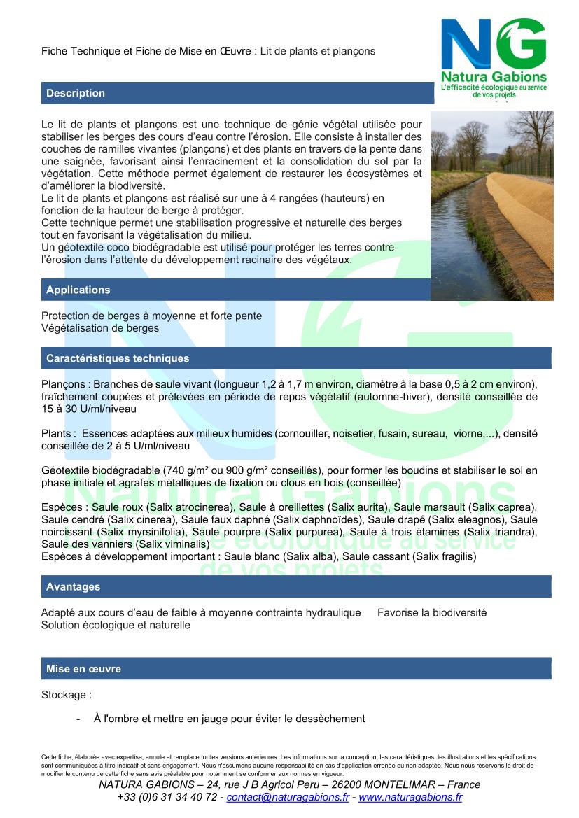 Le lit de plants et de plançons consiste à installer de jeunes plants en racines nues ou des plançons de saule en ligne, souvent en plusieurs couches. Ils s’enracinent et forment un réseau racinaire dense qui stabilise les sols. Le lit de pants et plançons consiste à effectuer des incisions le long d’une berge en formant des boudins de géotextiles coco (souvent de deux à quatre rangées). Chaque boudin étant planté de plants en racines nues (d’arbres et arbustes) et de plançons de saule.