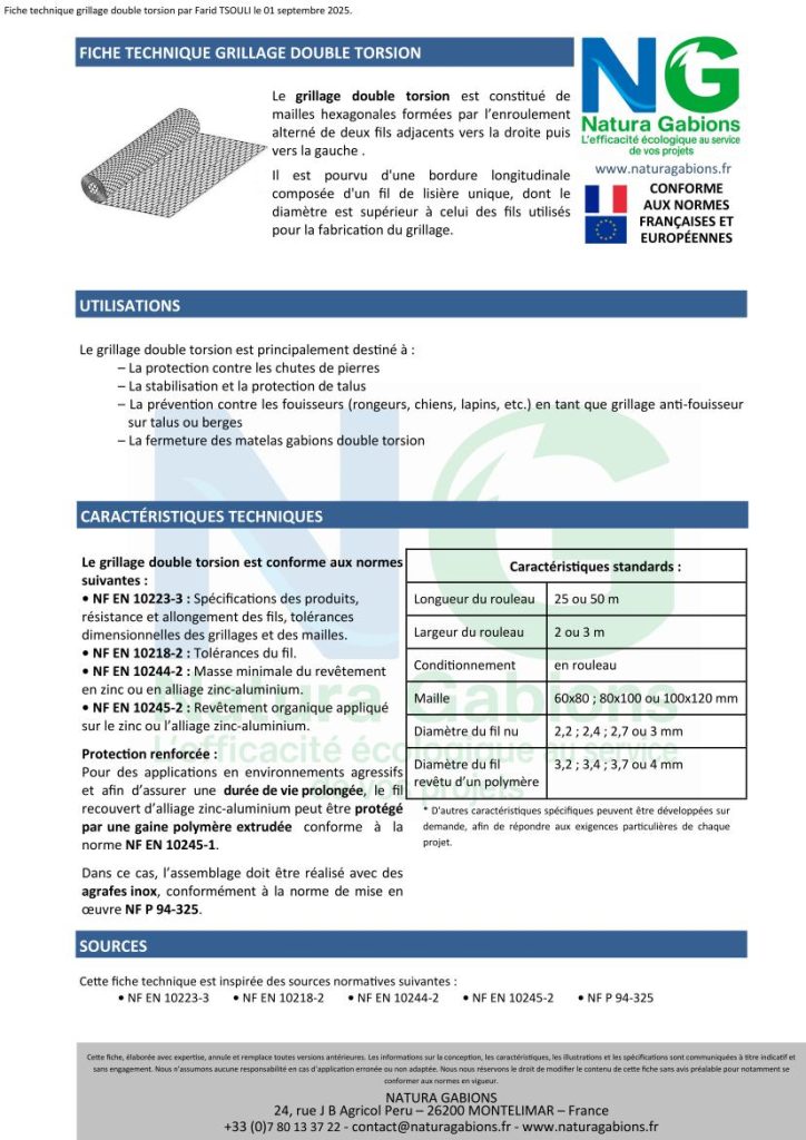 fiche technique gabions matelas double torsion Natura Gabions